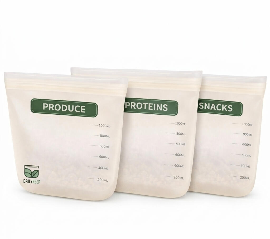 Silicone bags with a built-in labeling system—Produce, Proteins, Snacks. Everything has a place. Launching on Amazon soon.